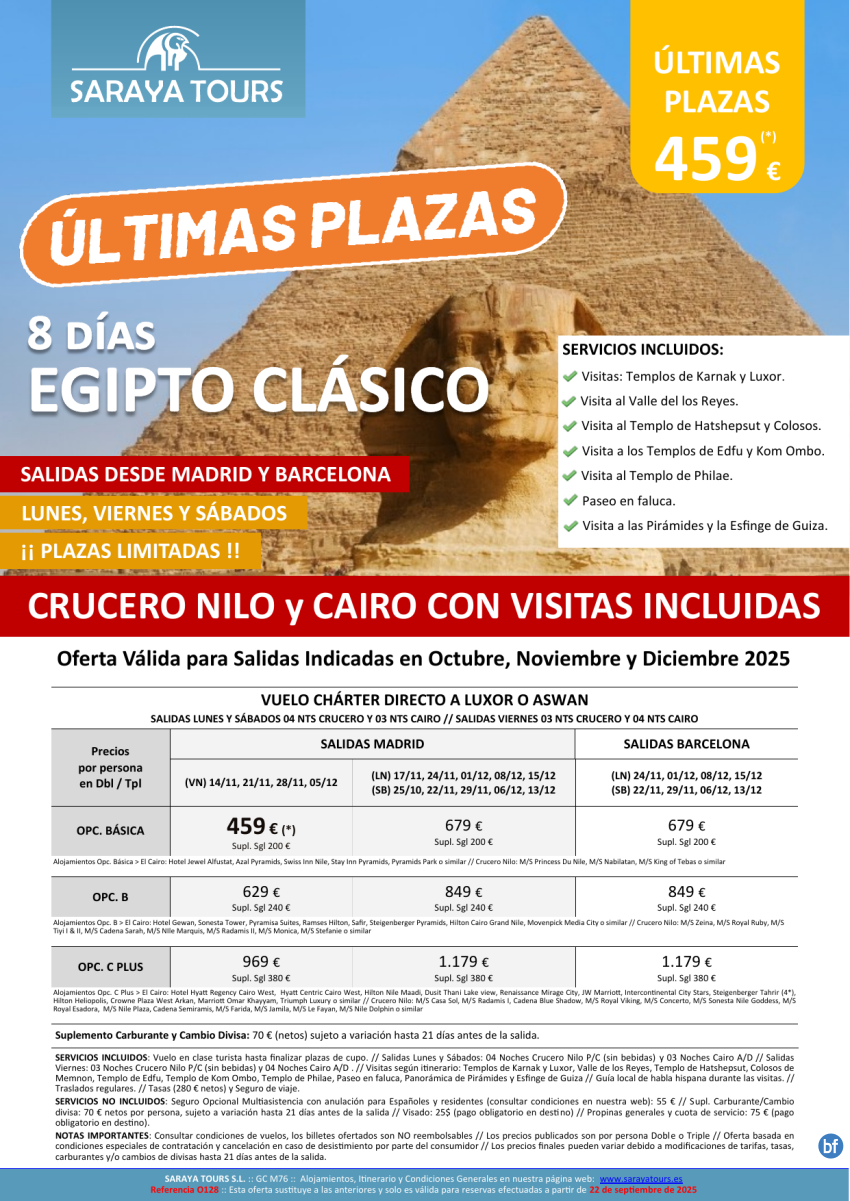 Últimas Plazas! Egipto Clásico 8d. dsd 459€ Vuelo directo, Crucero Nilo y Cairo con Visitas Plazas limitadas